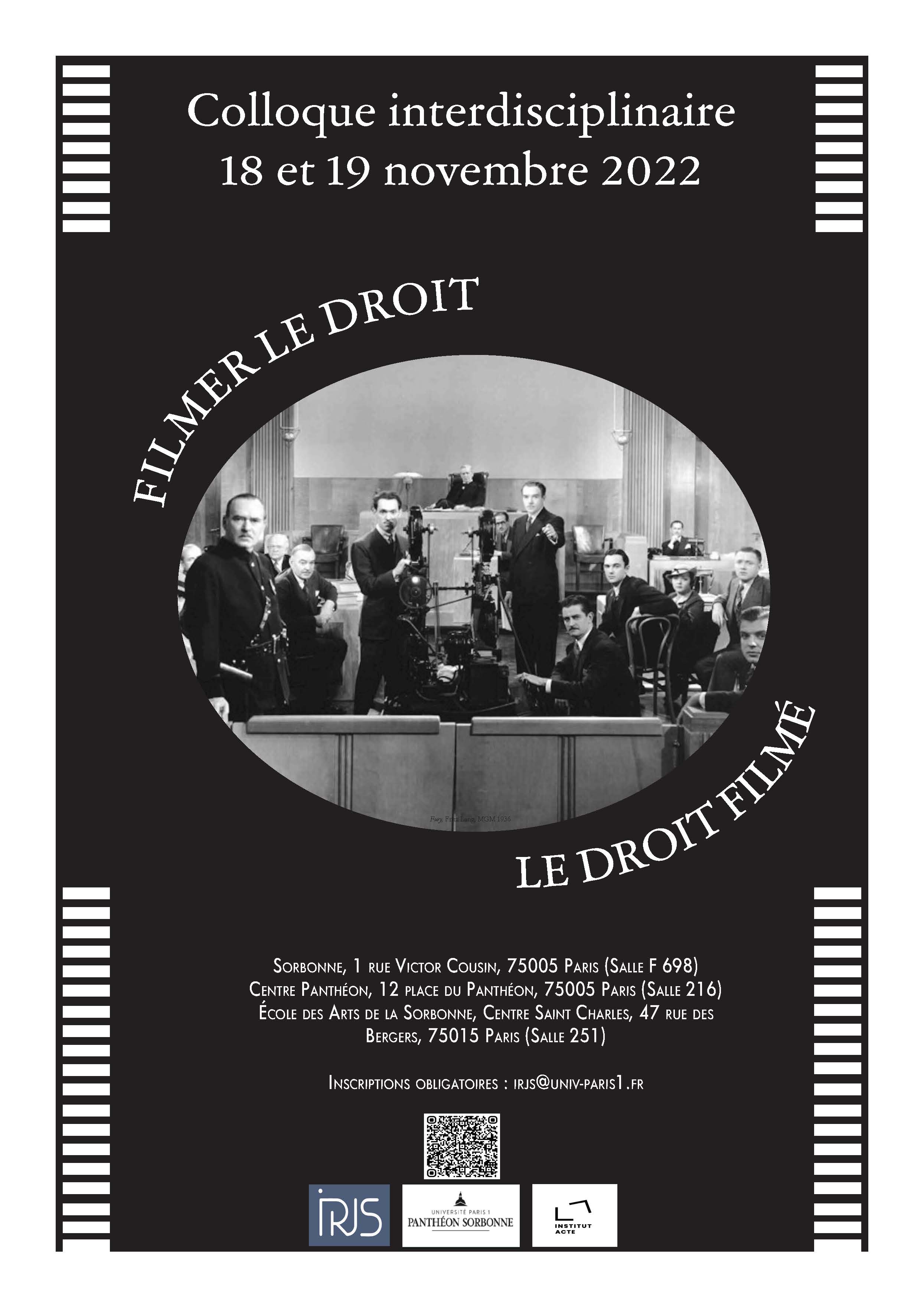 L'objectif de ce colloque est d'étudier les relations riches et complexes qu'entretiennent le droit et le cinéma, et dont le premier signe est le nombre impressionnant de films qui, depuis les débuts du cinéma, mettent en scène des questions ou des situations juridiques, racontent des histoires dont les protagonistes sont enquêteurs, juges, avocats, procureurs, victimes, accusés, détectives, gangsters, ou encore shérifs, marshals, outlaw, etc., transformant en décors ces lieux institutionnels de la justice que sont les tribunaux, les commissariats, les bureaux d'avocats ou les prisons, notamment.