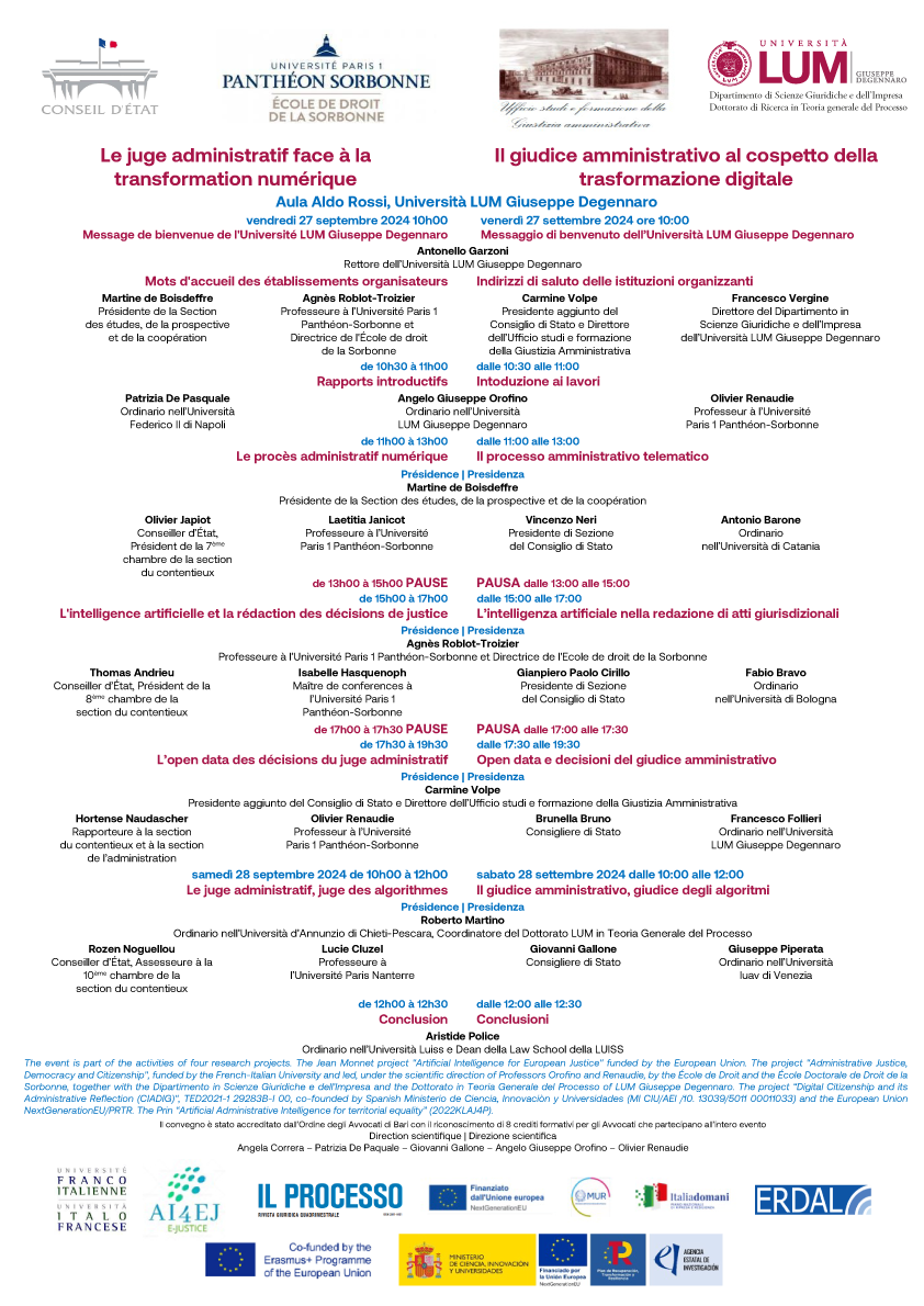 Colloque organisé par l'Université Paris 1 Panthéon Sorbonne, le Conseil d'État, le Conseil d'État italien et l'Università LUM Giuseppe Degennaro, sous la direction scientifique de Angela Correra – Patrizia De Pasquale – Giovanni Gallone – Angelo Giuseppe Orofino et Olivier Renaudie.