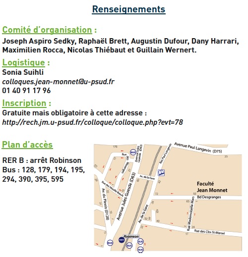Gratuite mais obligatoire à cette adresse : http://rech.jm.u-psud.fr/colloque/colloque.php?evt=78