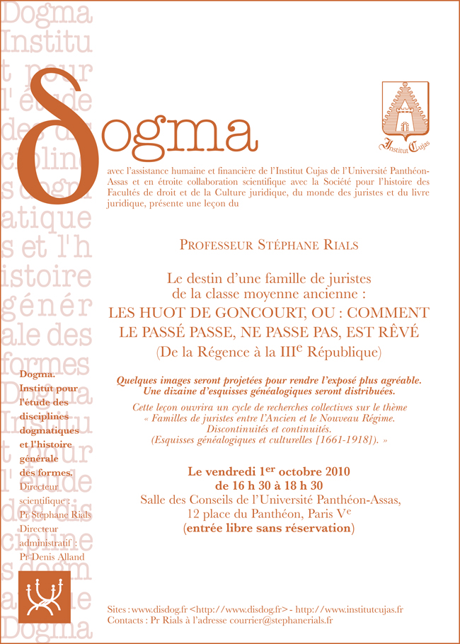 - 1er octobre 2010 (l6h30-l8h30). - Stéphane Rials, Le destin d'une ramille de juristes de la classe moyenne ancienne: Les Huot de Goncourt, ou comment le passé passe, ne passe pas, est rêvé (De la Régence à la IIIe République).
