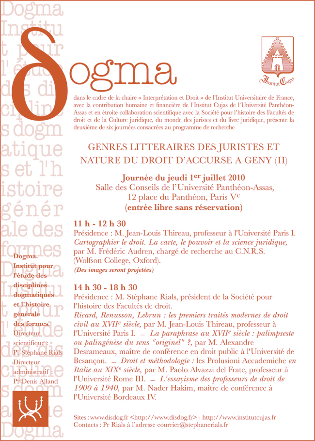 Journée du jeudi ler juillet 2010Genres littéraires de juristes et nature du droit d'Accurse à Gény (II) 11h-12h30Présidence: Jean-Louis Thireau, l'Université Paris l.