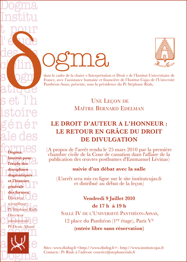 9 juillet 2010 (l7h-l9h). - Une leçon de Me Bernard Edelman, Les droit d'auteur à l'honneur: le retour en grâce du droit de divulgation (à propos de l'arrêt rendu le 21 mars 2010 par la première chambre civile de la Cour de cassation dans l'affaire de la publication des œuvres posthumes d'Emmanuel Lévinas)