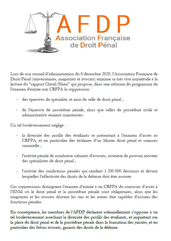 Lors de son conseil d’administration du 8 décembre 2020, l'Association Française de Droit Pénal (universitaires, magistrats et avocats) exprime sa très vive inquiétude à la lecture du "rapport Clavel/Haeri" qui propose, dans une réforme du programme de l'examen d'entrée aux CRFPA la suppression :