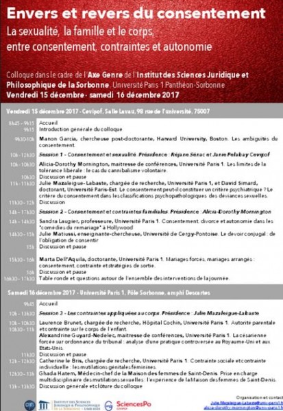 Colloque organisé dans le cadre de l'Axe Genre de l’Institut des Sciences Juridique et Philosophique de la Sorbonne, Université Paris 1 Panthéon-Sorbonne