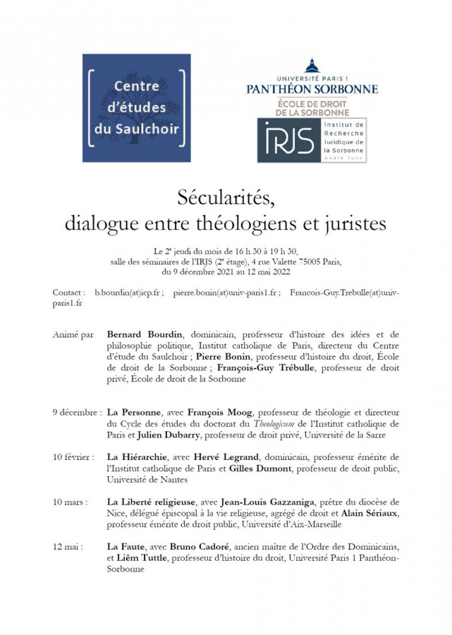 Organisé par le département de recherche Politique et religions du Collège des Bernardins, sous la direction de Jean-Baptiste Arnaud, Théologien et Co-Directeur du département de Politique et religions du Collège des Bernardins et Marie Dejoux, Maître de conférences en histoire médiévale, Université Paris 1 Panthéon-Sorbonne, Membre de l'Institut universitaire de France