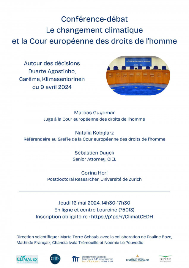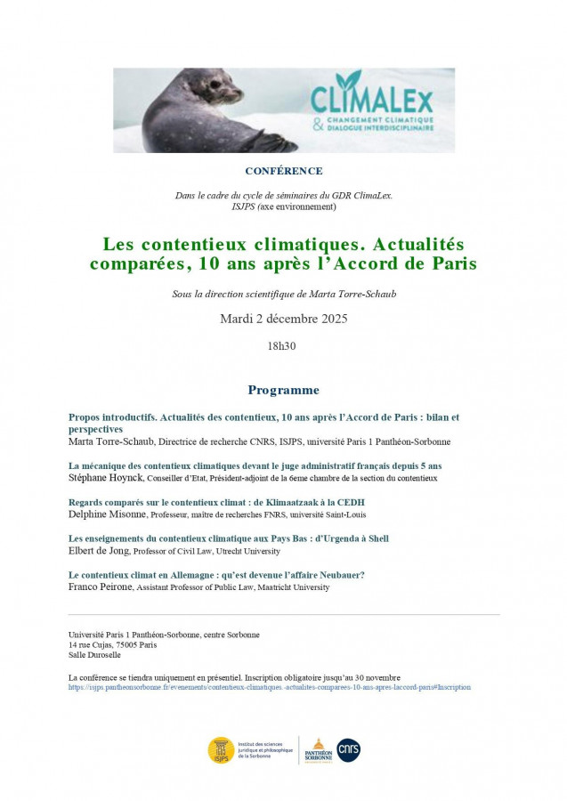 Organisé par le laboratoire Climalex, l’ISJPS, l’Ecole Doctorale de Droit de la Sorbonne, et le Master 2 Contentieux Public dans le cadre des Séminaires Environnement, Société, mobilisations du droit et du Projet FINCLIMLEX (ADEME)