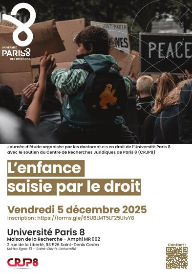 Journée d’étude organisée par les doctorant.e.s en droit de l’Université Paris 8 Vincennes – Saint-Denis avec le soutien du Centre de Recherches Juridiques de Paris 8 (CRJP8) sous la direction scientifique de Saïda El Boudouhi, Professeure de droit public, Université Paris 8 - Héloïse Meur, Maîtresse de conférences en droit privé, Université Paris 8 et Isabelle Ta, Maître de conférences en droit privé, Université Paris 8