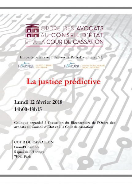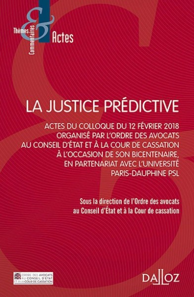 Sophie Lemaire, Soraya Amrani-Mekki, Louis Boré, Olivier Chaduteau, Arnaud de Chaisemartin, La justice prédictive: colloque organisé le 12 février 2018 par l'Ordre des avocats au Conseil d'État et à la Cour de cassation, en partenariat avec l'Université Paris-Dauphine PSL, à l'occasion de son bicentenaire, Dalloz, 2018, Thèmes et commentaires, 122 p.