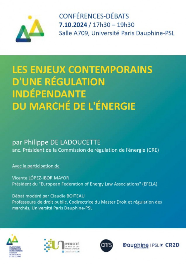 Organisé par l'AFDEN, Association Française de Droit de l’Energie, le CR2D, Université Paris-Dauphine, en partenariat avec le Master Droit et régulation des marchés (291) et l'UMR TREE, Université de Pau et des Pays de l’Adour / CNRS