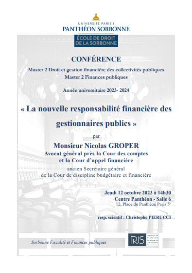 Conférence organisée par l'IRJS, Ecole de droit de la Sorbonne, dans le cadre des Masters 2 Finances publiques et Droit et gestion financière des collectivités publiques de l'Université Paris 1 sous la responsabilité scientifique de Christophe Pierucci, Professeur des Universités, Faculté de droit, de sciences politiques et de gestion de l'Université de Strasbourg, Institut de recherche Carré de Malberg (UR3399), Chargé de cours à Paris 1
