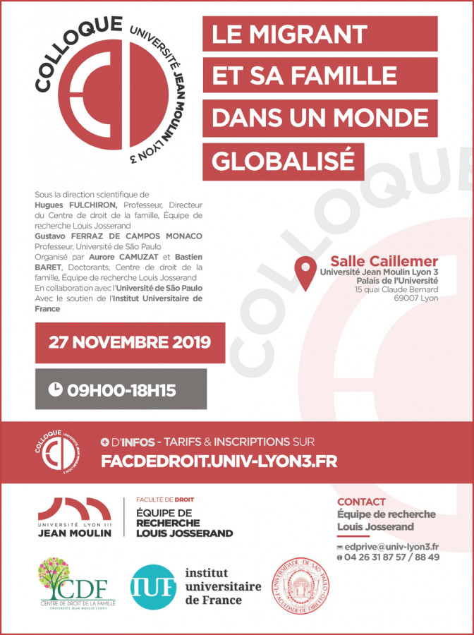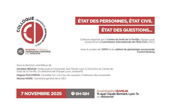 Colloque organisé par la Faculté de droit, Université Lyon 3 sous la direction scientifique de Christine Bidaud, Pr. à l’Université Jean Moulin Lyon 3, Directrice du Centre de droit de la famille, Co-directrice de l’Équipe Louis Josserand ; Hugues Fulchiron, Conseiller S.E. à la Cour de cassation, Directeur honoraire du Centre de droit de la famille, Pr. à l’Université Jean Moulin Lyon 3, Équipe Louis Josserand et Nicolas Nord, Secrétaire général de la CIEC