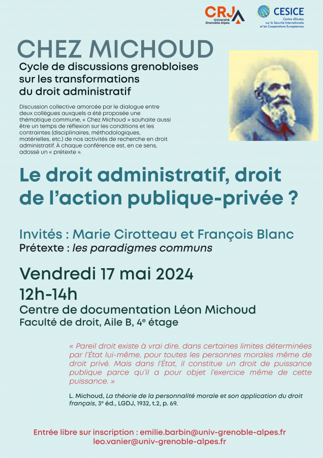 Conférence organisée par le CRJ Grenoble et le CESICE dans le cadre du cycle « Chez Michoud » - Cycle de discussions grenobloises sur les transformations du droit administratif sous la direction scientifique de Léo Vanier et Emilie Barbin (CESICE)