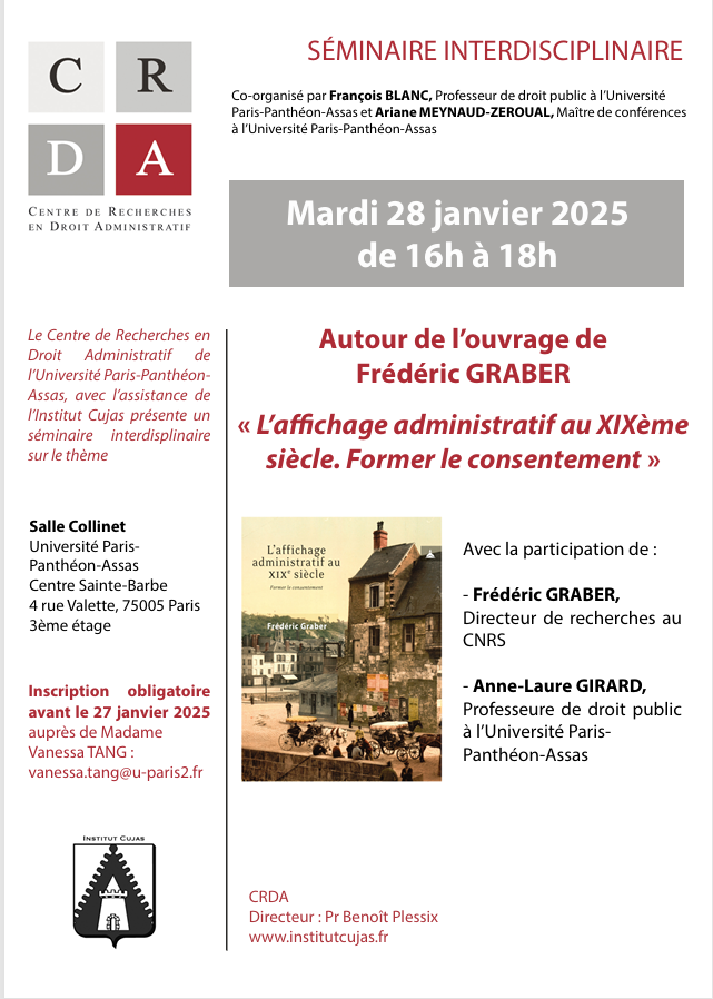 Séminaire organisé par le Centre de Recherches en Droit Administratif de l'Université Paris-Panthéon-Assas, avec l'assistance de l'Institut Cujas sous la direction scientifique de François Blanc, Pr. de droit public à l'Université Paris-Panthéon-Assas et Ariane Meynaud-Zeroual, MCF à l'Université Paris-Panthéon-Assas