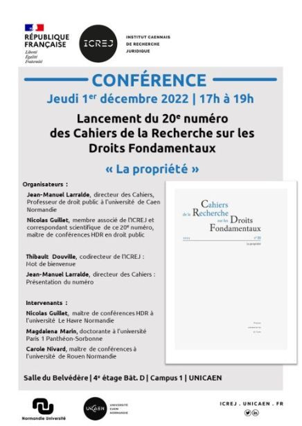 Organisé par l'ICREJ, UNICAEN sous la direction de Jean-Manuel Larralde, Directeur des Cahiers, Pr. de droit public à l’Univ. de Caen Normandie et Nicolas Guillet, Membre associé de l’ICREJ et correspondant scientifique de ce 20e numéro, MCF HDR en droit public à l’Univ. Le Havre Normandie