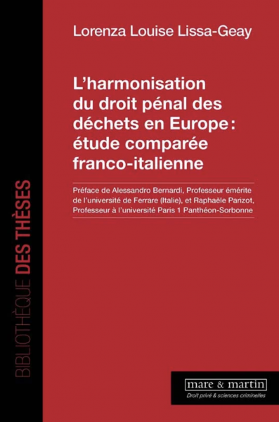 Raphaële Parizot, Lorenza Louise Lissa-Geay, Alessandro Bernardi, L'harmonisation du droit pénal des déchets en Europe: étude comparée franco-italienne, mare & martin, 2025, Bibliothèque des thèses (Droit privé et sciences criminelles), 732 p.