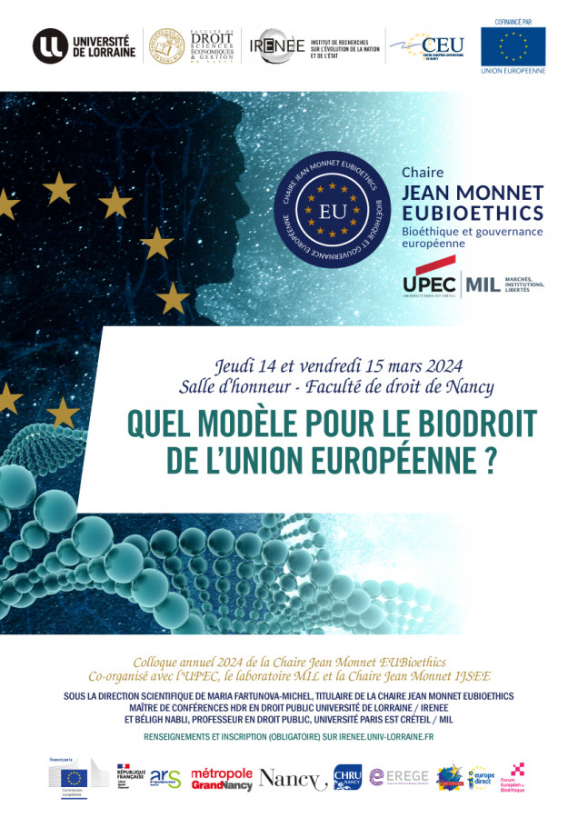 Colloque annuel 2024 Chaire EUBioethics organisé par l'IRENEE, Université de Lorraine avec l’UPEC, le laboratoire MIL et la Chaire Jean Monnet IJSEE sous la direction scientifique de Maria Fartunova-Michel, MCF HDR, Université de Lorraine/IRENEE et Béligh Nabli, Professeur de droit public, Université Paris Est-Créteil/MIL