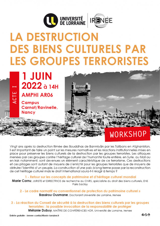 Mélanie Dubuy, « Conférence n° 3 : La réaction du Conseil de sécurité à la destruction des biens culturels par les groupes terroristes : la possible invocation de la responsabilité de protéger », Workshop : La destruction des biens culturels par les groupes terroristes - Acte I, Nancy, le 01 juin 2022