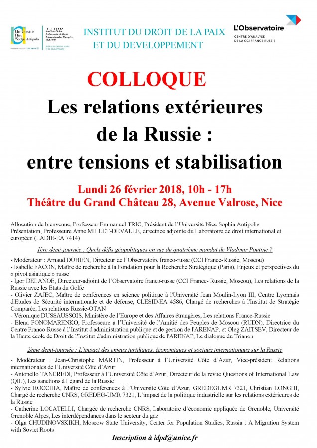 Troisième édition organisée conjointement par le Laboratoire de droit international et européen (LADIE-EA 7414) de l’Université Nice Sophia Antipolis et l’Observatoire franco-russe, Centre d’analyse de la Chambre de commerce France-Russie.