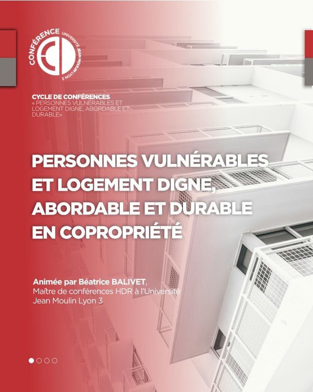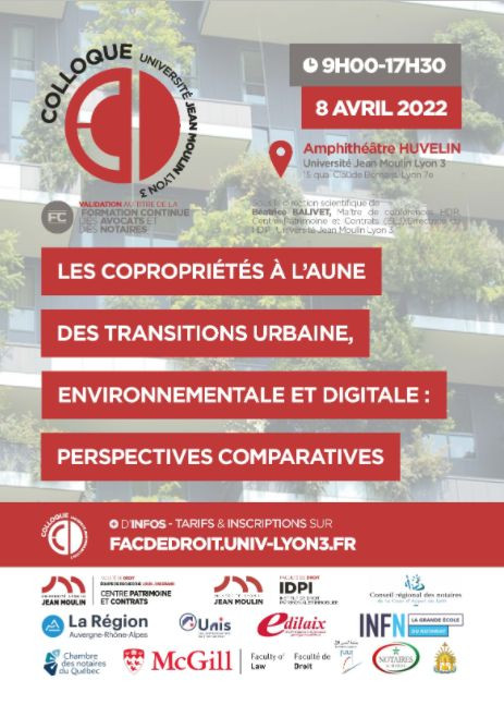 Cycle de conférences organisé par la faculté de droit, Lyon 3 dirigé par Béatrice Balivet, MCF à l'Université Jean Moulin Lyon 3, Directrice de l'IDPI et membre de l'Equipe Louis Josserand, Jézabel Jannot, Directrice de l'INFN site de Lyon, Directrice adjointe de l'INFN et Yaëll Emerich, Pr. à l'Université Mc Gill, titulaire de la Chaire de recherche du Canada en droit des biens transsystémique et communautés durables
