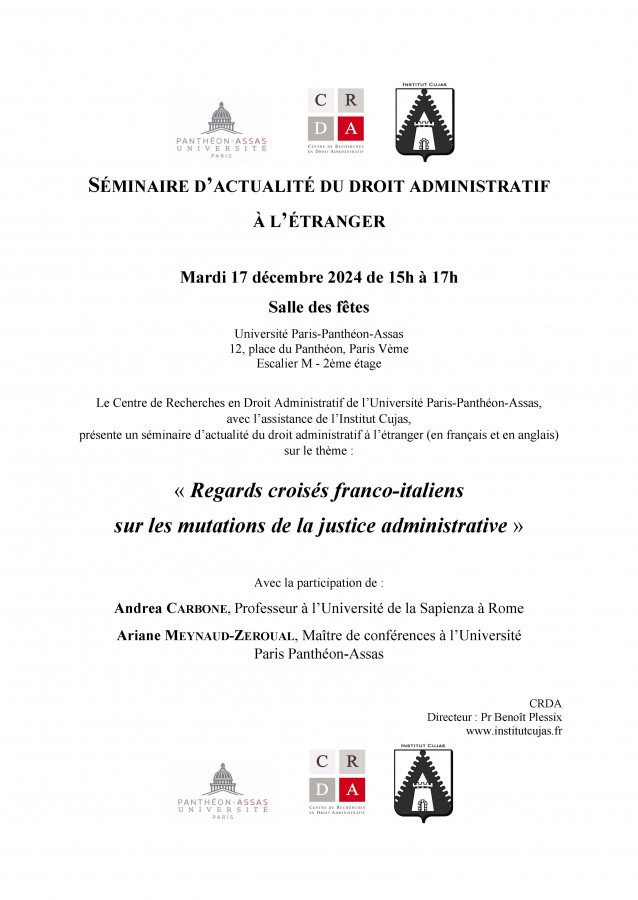 Séminaire organisé par le Centre de Recherches en Droit Administratif de l'Université Paris-Panthéon-Assas, avec l'assistance de l'Institut Cujas sous la direction scientifique de François Blanc, Pr. de droit public à l'Université Paris-Panthéon-Assas et Ariane Meynaud-Zeroual, MCF à l'Université Paris-Panthéon-Assas