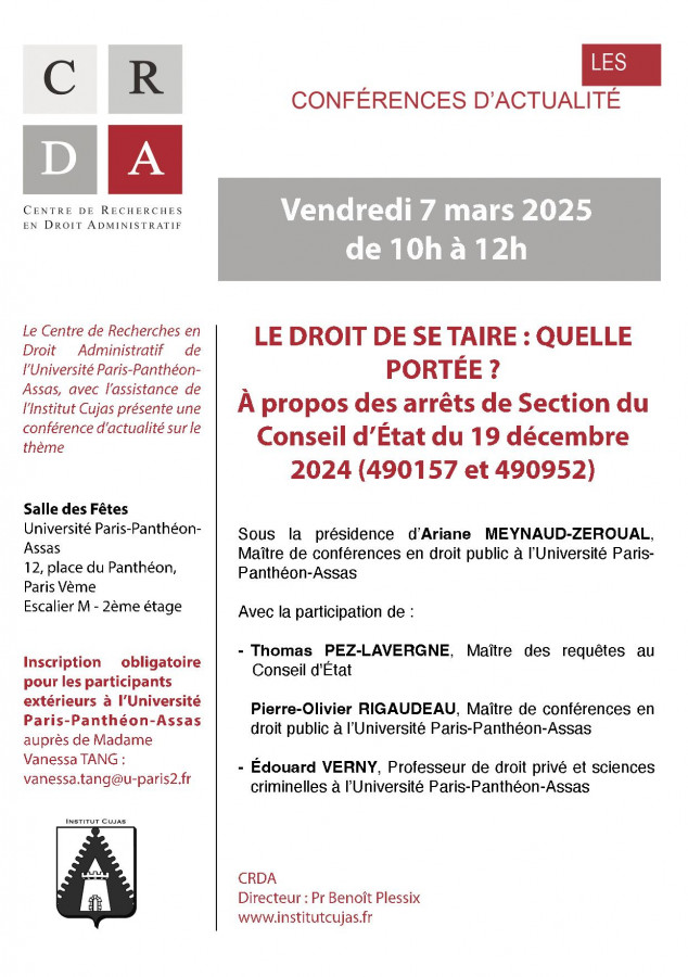 Conférence d'actualité du CRDA, Centre de Recherches en Droit Administratif de l’Université Paris-Panthéon-Assas, avec l’assistance de l’Institut Cujas sous la présidence d’Ariane Meynaud-Zeroual, Maître de conférences en droit public à l’Université Paris-Panthéon-Assas