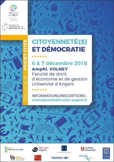 Organisé par le Centre Jean Bodin sous la responsabilité de Félicien Lemaire, Professeur de Droit public, directeur du Centre Jean Bodin, Univ. d’Angers et Stéphanie Couderc-Morandeau, Ingénieur d'Etudes CNRS, Droit et changement social, Univ.Nantes
