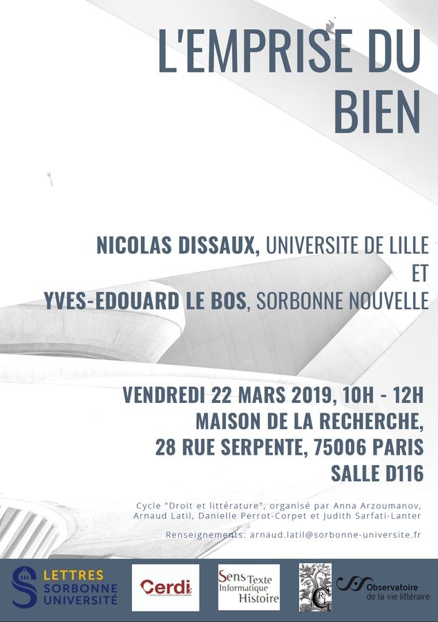 Conférence organisée dans le cadre du Cycle "Droit et littérature", organisé par Anna Arzoumanov, Arnaud Latil, Danielle Perrot-Corpet et Judith Sarfati-Lanter