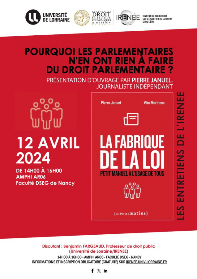 Conférence organisée par l'IRENEE, Université de lorraine dans le cadre du cycle "Entretien de l'IRENEE" sous la direction scientifique de Laurent Seurot, Directeur de l’IRENEE, Professeur de droit public, Université de Lorraine/IRENEE