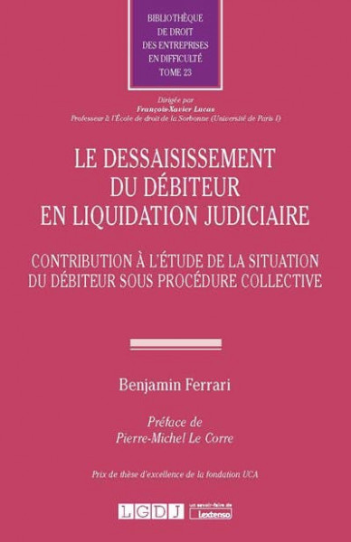 Benjamin Ferrari, Le dessaisissement du débiteur en liquidation judiciaire: contribution à l'étude de la situation du débiteur sous procédure collective, Librairie générale de droit, de jurisprudence et un savoir faire de Lextenso, 2021, Bibliothèque de droit des entreprises en difficulté, 568 p.