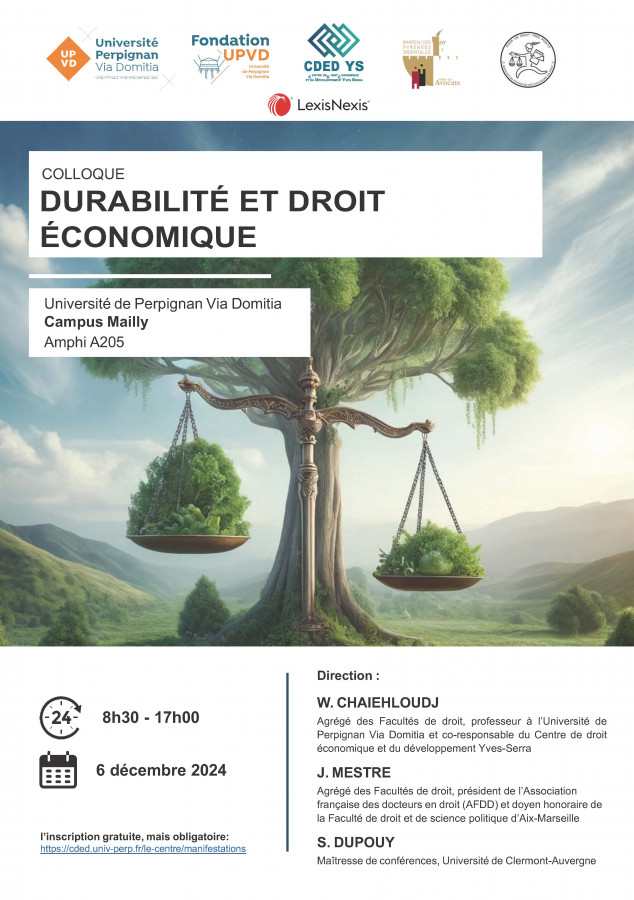 Colloque organisé sous la direction de Walid Chaiehloudj, Agrégé des Facultés de droit, professeur à l’Université de Perpignan Via Domitia et co-responsable du Centre de droit économique et du développement Yves-Serra, Jacques Mestre, Agrégé des Facultés de droit, président de l’Association française des docteurs en droit (AFDD) et doyen honoraire de la Faculté de droit et de science politique d’Aix-Marseille et Sabrina Dupouy, Maîtresse de conférences, Université de Clermont-Auvergne.