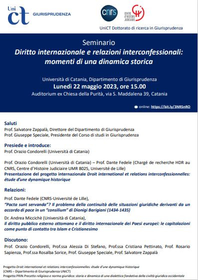 Dante Fedele, « “Pacta sunt servanda”? Il problema della continuità delle situazioni giuridiche derivanti da un accordo di pace in un “consilium” di Dionigi Barigiani (1434-1435) », Diritto internazionale e relazioni interconfessionali: momenti di una dinamica storica, Catania Italy, le 22 mai 2023