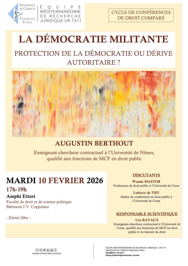 Conférence organisée par l'EMRJ, Université de Corse sous la responsabilité scientifique de Léo Ravaux, Enseignant-chercheur contractuel à l’Université de Corse, qualifié aux fonctions de MCF en droit public et en histoire du droit.