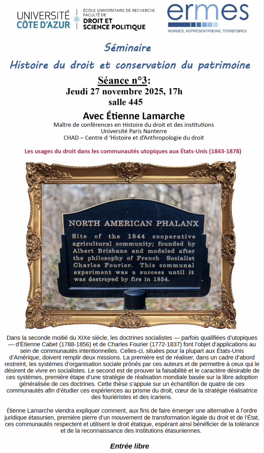 Dans la seconde moitié du XIXe siècle, les doctrines socialistes — parfois qualifiées d’utopiques — d’Étienne Cabet (1788-1856) et de Charles Fourier (1772-1837) font l’objet d’applications au sein de communautés intentionnelles. Celles-ci, situées pour la plupart aux États-Unis d’Amérique, doivent remplir deux missions. La première est de réaliser, dans un cadre d’abord restreint, les systèmes d’organisation sociale prônés par ces auteurs et de permettre à ceux le désirant de vivre en socialistes. Le second est de prouver aux yeux de tous la faisabilité et le caractère désirable de ces systèmes, première étape d’une stratégie de réalisation mondiale basée sur la libre adoption généralisée de ces doctrines. Cette thèse s’appuie sur un échantillon de quatre de ces communautés afin d’étudier ces expériences au prisme du droit, cœur de la stratégie réalisatrice des fouriéristes et des icariens. Ces derniers fondent en effet le caractère socialiste de leurs communautés par d’importantes législations internes, développant autant d’ordres juridiques alternatifs à celui de l’État. Mais pour cela, et afin de bénéficier de la tolérance et de la reconnaissance des institutions étasuniennes, ils respectent et utilisent le droit étatique. Ils espèrent ainsi faire émerger une alternative à l’ordre juridique étasunien, première pierre d’un mouvement de transformation du droit et de l’État, de manière légale.