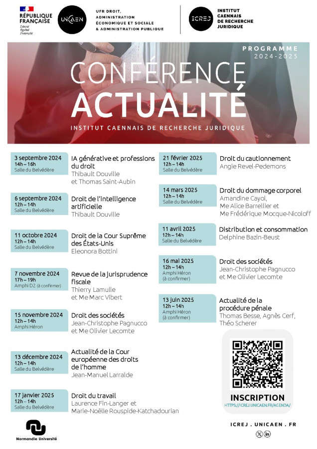 Cycle de conférences organisé par l'ICREJ, Université de Caen-Normandie sous la direction scientifique de Jean-Christophe Pagnucco, Professeur de droit privé et sciences criminelles à l'Université de Caen Normandie