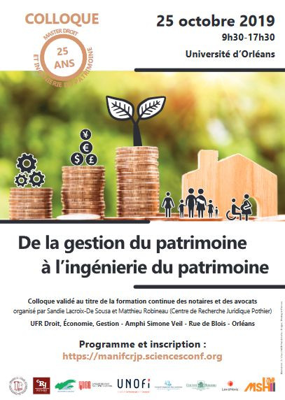 Organisé par Sandie Lacroix-De Sousa et Matthieu Robineau du Centre de Recherche Juridique Pothier (EA 1212), à l’occasion des 25 ans du master droit et ingénierie du patrimoine de l’Université d’Orléans