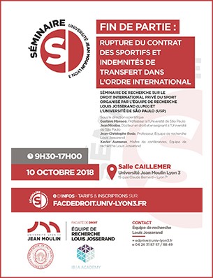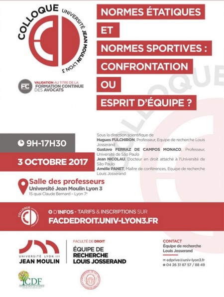 Colloque organisé par le CDE, Faculté de droit, Université Lyon 3 avec l'Université de Sherbrooke - Québec sous la direction scientifique de Xavier Aumeran, Pr. à l'Université Jean Moulin Lyon 3, Centre de Droit de l'entreprise, Equipe Louis Josserand et David Pavot, Pr. à l'Université de Sherbrooke, titulaire de la Chaire de recherche sur le sport responsable