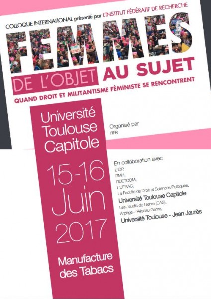 Organisé par l’IFR de Droit, UT1 Capitole, avec L’IDP, l’IMH,l’IDETCOM,UT1 Capitole, L’UFRAC, UT1 Capitole, La Faculté de Droit et Sciences Politiques, UT1 Capitole, Les Jeudis du Genre (CAS), UT2 Jean Jaurès, Arpège – Réseau Genre, UT2 Jean Jaurès