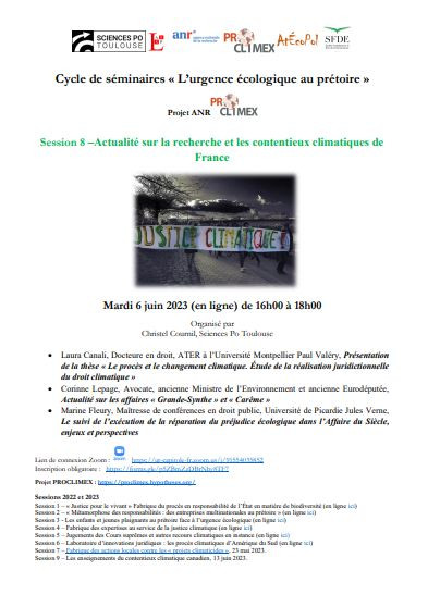 Séminaire organisé par Christel Cournil, Professeure de droit public, Sciences Po Toulouse dans le cadre du Cycle "L'urgence écologique au prétoire" du programme ANR PROCLIMEX et du programme ALCOM