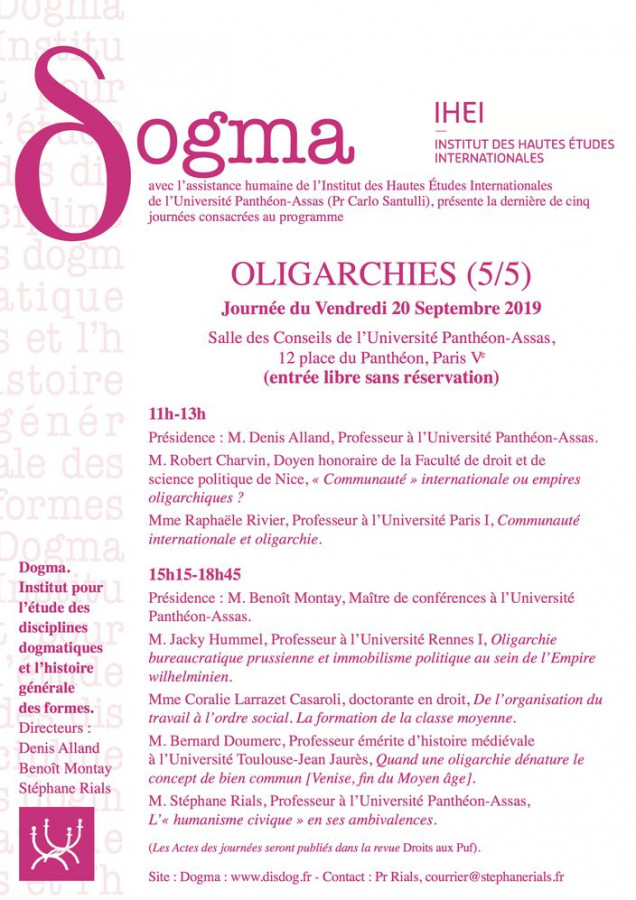 Dogma. Institut pour l’étude des disciplines dogmatiques et l’histoire générale des formes, avec l’assistance humaine de l’IHEI (Université Panthéon-Assas) présente la dernière de cinq journées consacrées au programme « Oligarchies ».