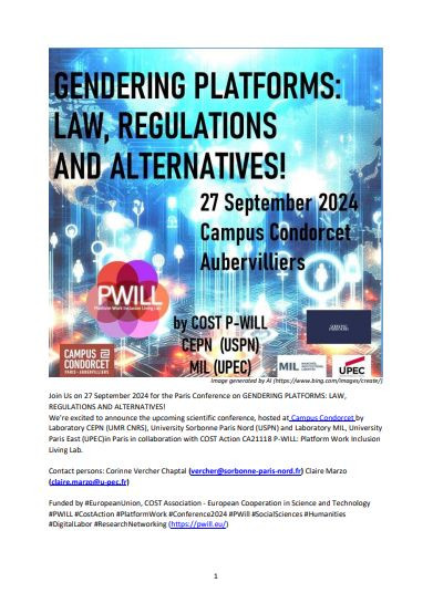 Conference organised by Laboratory CEPN (UMR CNRS), University Sorbonne Paris Nord (USPN) and Laboratory MIL, University Paris East (UPEC)in Paris in collaboration with COST Action CA21118 P-WILL : Platform Work Inclusion Living Lab