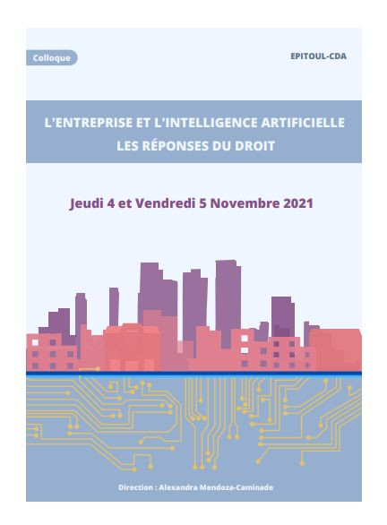 Désormais omniprésente dans la vie des entreprises, l'Intelligence artificielle suscite de nombreux questionnements auxquels le Droit devra apporter des réponses qu'il s'agisse de l'organisation elle-même de la structure ou plus largement de son activité. Le colloque organisé à Toulouse les 4 et 5 novembre 2021 avait pour objet de procéder à la restitution de travaux rédigés dans le cadre de la parution de cet ouvrage : lors des deux journées du colloque, un panorama a été dressé dans divers champs juridiques des questions générées par l'IA et des solutions envisageables. Cette restitution a été l'occasion d'échanger sur les perspectives possibles et souhaitables. La direction scientifique de la conférence était assurée par le professeur Alexandra Mendoza-Caminade (Directrice équipe EPITOUL-CDA, Directrice du Master Droit de la Propriété Intellectuelle, Université Toulouse 1 Capitole). Le colloque était co-organisé par l'Axe Epitoul de l'Institut Fédératif de Recherche en Droit, le Centre de Droit des Affaires et la Faculté de Droit et Science Politique dans le cadre de Partenariat Hubert Curien (PHC SAKURA)