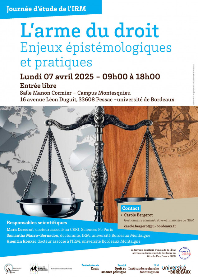 Journée d'étude organisée par l'IRM, l’Ecole doctorale de droit et la Faculté de droit, Université de Bordeaux, Université de Bordeaux-Motaigne sous la responsabilité scientifique de Mark Corcoral, Docteur associé au CERI, Sciences Po Paris - Samantha Marro-Bernadou, Doctorante, IRM, Université Bordeaux Montaigne et Quentin Rouxel, Docteur associé à l’IRM, Université Bordeaux Montaigne.