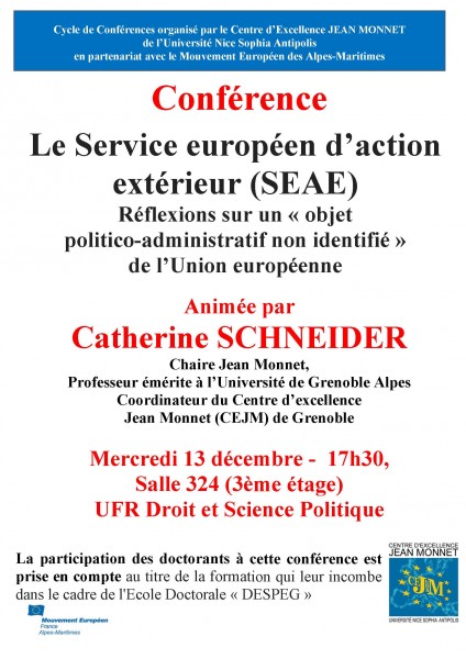Catherine Schneider, « Le Service Européen d'Action Extérieur (SEAE). Réflexions sur un objet politico-administratif non identifié de l'Union européenne », Le Service Européen d'Action Extérieur (SEAE). Réflexions sur un "objet politico-administratif non identifié" de l'Union européenne, Nice, le 13 décembre 2017