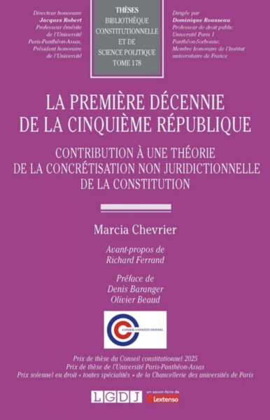 Marcia Chevrier, La première décennie de la Cinquième République: contribution à une théorie de la concrétisation non juridictionnelle de la constitution, LGDJ un savoir faire Lextenso, 2025, Thèses (Bibliothèque constitutionnelle et de science politique), 481 p.