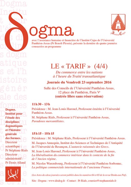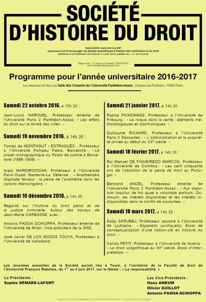 Jean-Louis Harouel, « Programme des séances de la Société d'Histoire du Droit », le 22 octobre 2016