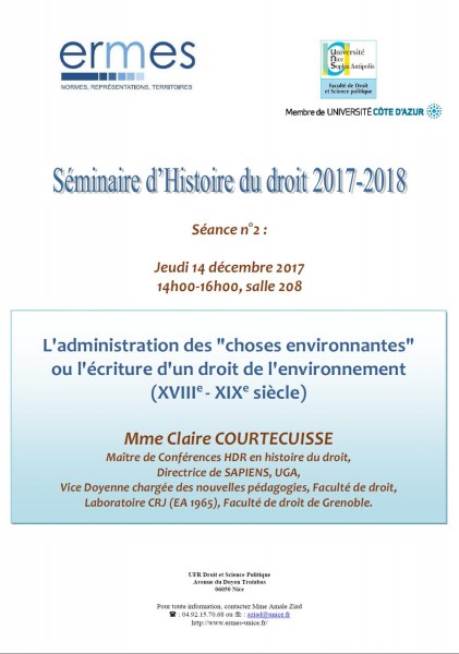 Claire Courtecuisse, « L'administration des choses environnantes ou l'écriture d'un droit de l'environnement (XVIIIe - XIXe siècle) », Séminaire d'Histoire du droit 2017-2018, Nice, le 14 décembre 2017