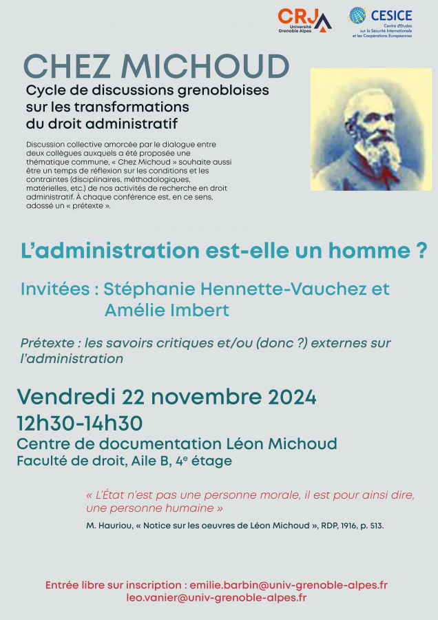 Amélie Imbert, « L'administration est-elle un homme ? Les savoirs critiques et/ou (donc ?) externes sur l'administration », Chez Michoud : Cycle de discussions grenobloises sur les transformations du droit administratif, Saint-Martin-d'Hères, le 22 novembre 2024